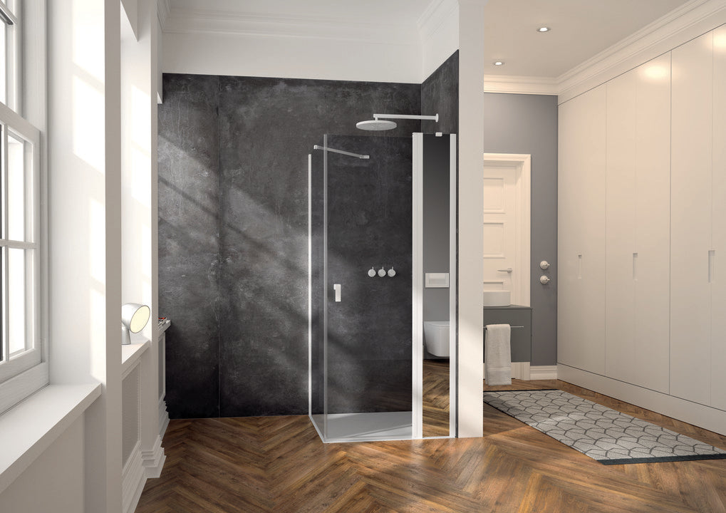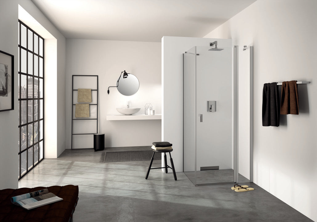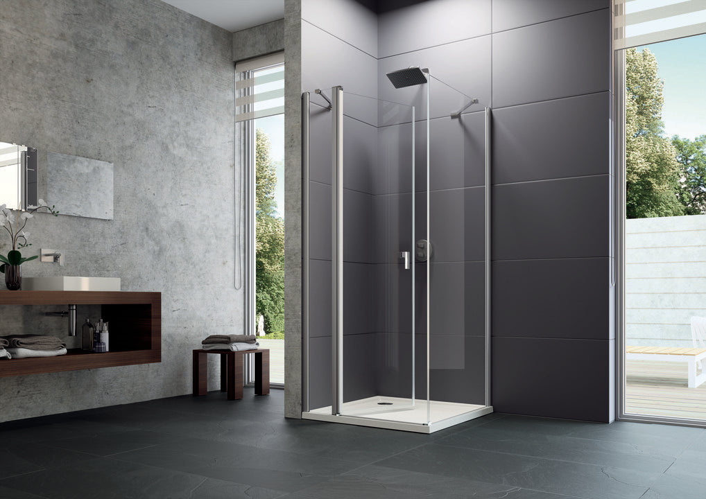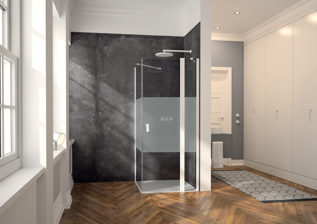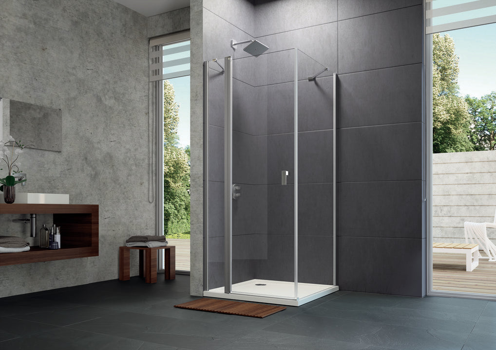 • Částečně orámované dveře s jedním skleněným křídlem s pevným segmentem, otevíraným dovnitř a ven. Při montáži s boční stěnou pro otevírání dovnitř je nutný doplňkový set pro otevírání dovnitř a ven