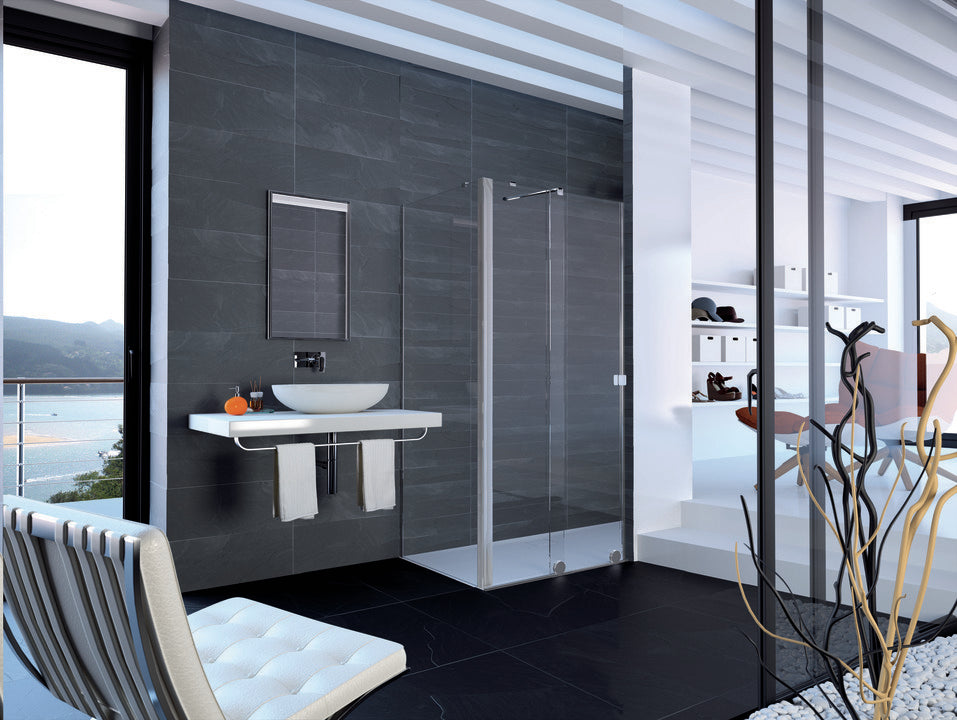 Drzwi przesuwne Walk-In z segmentem nieruchomym od szerokości 1200 mm wymagają wspornika poprzecznego zamiast stabilizatora.