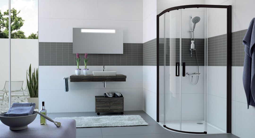 • Partially framed quadrant shower enclosure with two sliding door segments,