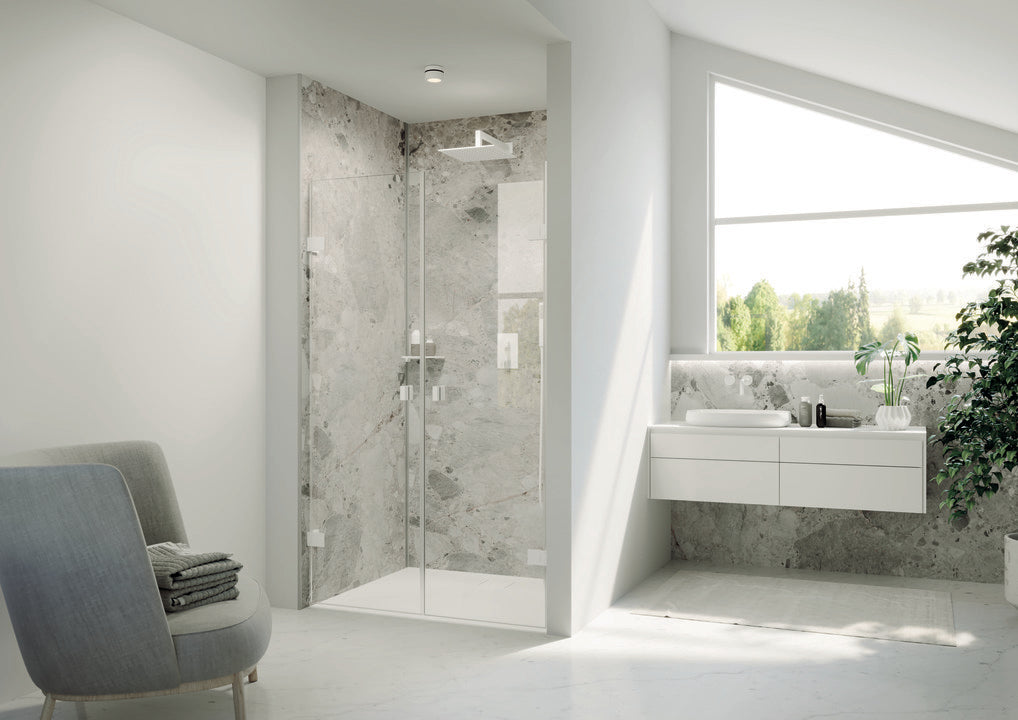 • Üvegezés 8 mm-es DIN EN 12150 szerinti egyrétegű biztonsági üveggel, opcionálisan könnyen ápolható HÜPPE Anti-Plaque felületnemesítő eljárással