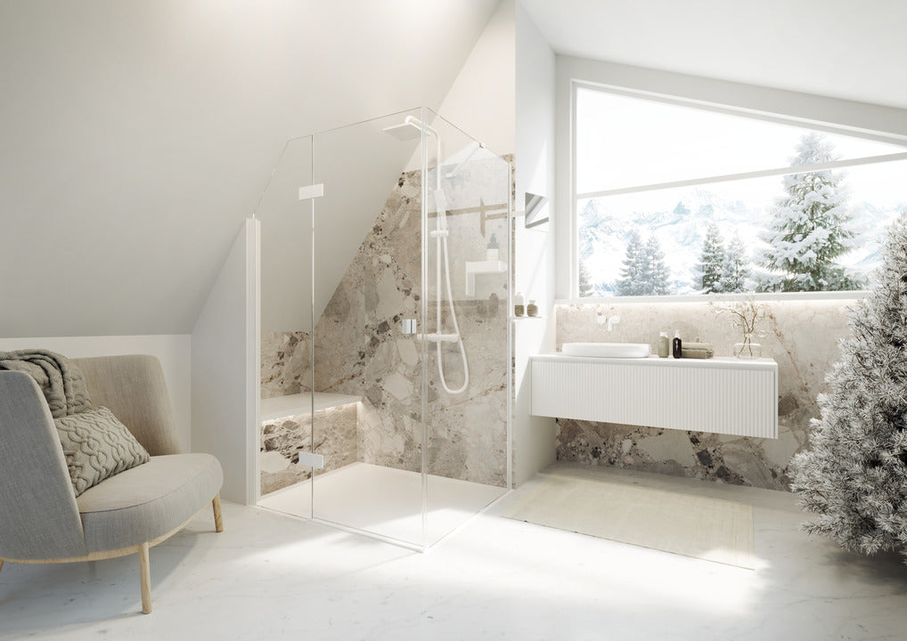 • HÜPPE keder-technikával - szerelés láthatatlan csavarokkal a fali profilnál